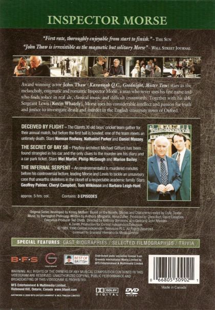 Award-winning actor John Thaw stars as the melancholy, enigmatic and romantic Inspector Morse, a man who never uses his first name and who finds solace in real ale, classical music and difficult crosswords. Together with his able Sergeant Lewis, Morse uses his considerable intellect and passion for truth and justice to investigate death and murder in the English university town of Oxford.
