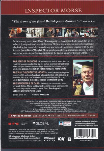 Award-winning actor John Thaw stars as the melancholy, enigmatic and romantic Inspector Morse, a man who never uses his first name and who finds solace in real ale, classical music and difficult crosswords. Together with his able Sergeant Lewis, Morse uses his considerable intellect and passion for truth and justice to investigate death and murder in the English university town of Oxford.