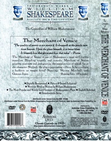 A rich merchant, Antonio is depressed for no good reason, until his good friend Bassanio comes to tell him how he's in love with Portia. Portia's father has died and left a very strange will: only the man that picks the correct casket out of three (silver, gold, and lead) can marry her. Bassanio, unfortunately, is strapped for cash with which to go wooing, and Antonio wants to help, so Antonio borrows the money from Shylock, the money-lender. But Shylock has been nursing a grudge against Antonio's insults, and makes unusual terms to the loan. And when Antonio's business fails, those terms threaten his life, and it's up to Bassanio and Portia to save him.