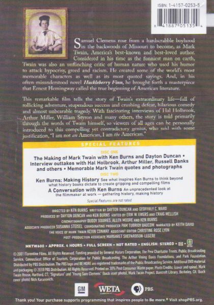 This remarkable film tells the story of Twain's extraordinary life - full of rollicking adventure, stupendous success and crushing defeat, hilarious comedy and almost unbearable tragedy. With fascinating interviews of Hal Holbrook, Arthur Miller, William Styron and many others, the story is told primarily through the words of Twain himself, so viewers of all ages can be personally introduced to this compelling yet contradictory genius, who said with some justification, "I am not an American, I am the American."