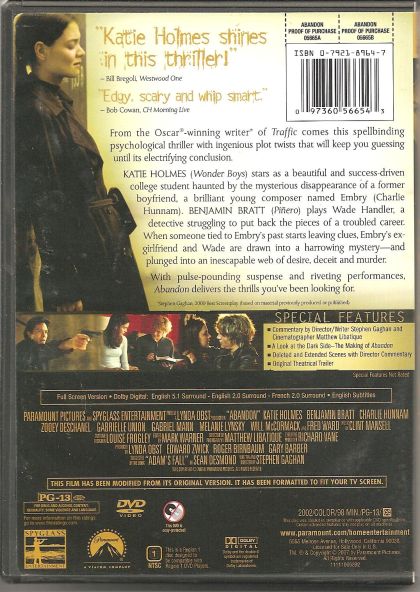 From the Oscar®-winning writer of "Traffic" comes this spellbinding psychological thriller with ingenious plot twists that will keep you guessing until its electrifying conclusion.Katie Holmes ("Wonder Boys") stars as a beautiful and success-driven college student haunted by the mysterious disappearance of a former boyfriend, a brilliant young composer named Embry (Charlie Hunnam), Benjamin Bratt ("Piñero") plays Wade Handler, a detective struggling to put back the pieces of his troubled career. When someone tied to Embry's past starts leaving clues, Embry's ex-girlfriend and Wade are drawn into a harrowing mystery-and plunged into an inescapable web of desire, deceit and murder.With pulse-pounding suspense and riveting performances. "Abandon" delivers the thrills you've been looking for.