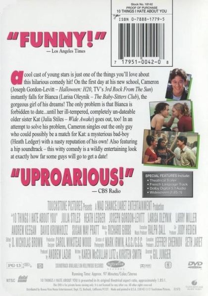 A cool cast of young stars is just one of the things you'll love about this hilarious comedy hit! On the first day at his new school, Cameron (Joseph Gordon-Levitt – Halloween: H20, TV's 3rd Rock From The Sun) instantly falls for Bianca (Larisa Oleynik – The Baby-Sitters Club), the gorgeous girl of his dreams! The only problem is that Bianca is forbidden to date...until her ill-tempered, completely un-dateable older sister Kat (Julia Stiles – Wide Awake) goes out, too! In an attempt to solve his problem, Cameron singles out the only guy who could possibly be a match for Kat: a mysterious bad-boy (Heath Ledger) with a nasty reputation of his own! Also featuring a hip soundtrack – this witty comedy is a wildly entertaining look at exactly how far some guys will go to get a date!