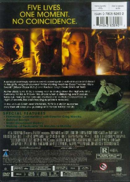 A series of seemingly random events converge in a web of murder and deceit in this gritty, edge-of-your-seat thriller starring two-time Oscar®-winner Hilary Swank* (Million Dollar Baby) and Rachael Leigh Cook (She's All That).As the clock turns 11:14, a young man is driving down the highway and suddenly his life is thrown into chaos when a disturbing event occurs. Turns out, many in the town are involved and as their stories unfold, a night of secrets, lies and shocking surprises is revealed.In the vein of Crash and Memento, 11:14 is a stylish suspense story that will keep you guessing until the last fateful minute.*Best Actress - 1999, Boys Don't Cry and 2004, Million Dollar Baby.