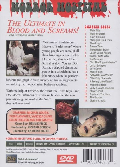 When attempts to break into the pop business leaves him with nothing but a bloody nose songwriter Jason Jones (Robin Askwith) decides to take a break with "Hairy Holidays", an outfit run by shifty, gay travel agent Pollock (Dennis Price). After failing to chat Jason up, Pollock sends him to pseudo-health farm- Brittlehurst Manor. On the train journey there Jason meets Judy (Vanessa Shaw) who is also on the way to the same destination to meet her long lost Aunt. Both are unaware that the health farm (ie "Horror Hospital") is a front for Dr Storm (Michael Gough) and his lobotomy experiments that turn wayward hippies into his mindless zombie slaves. The wheel-chair bound Doctor surrounds himself with an entourage that including Judy's aunt, and erstwhile brothel madam, Olga (Ellen Pollock), dwarf Frederick (Skip Martin) and numerous zombie bikers thugs. Dr Storm also has a Rolls-Royce fitted with a giant blade that decapitates escapees and interfering parties. Abraham (Kurt Christian) arrives at the Horror Hospital "looking for his chick" and is promptly whacked around the head by the motorcycle zombies. Frederick, fed up at literally being Storm's whipping boy helps the kids escape- paving the way for Seventies youth to put the final spanner in the works of Storm's scheme.