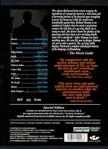 One of director Alfred Hitchcock's earliest 'wrong man' thrillers that would inspire many of his future classics. While vacationing in London, Richard Hannay (Robert Donat) takes in a vaudeville act that soon draws him into a world of espionage and intrigue. He meets Annabella Smith (Lucie Mannheim) at the show and attempts to help her flee a foreign spy organization known as The 39 Steps. However, she is soon murdered and Hannay finds himself on the run from both the spies and the police who think he is the murderer. He links up with the beautiful blond Pamela (Madeleine Carroll), who is eventually convinced of his innocence and tries to help him clear his name.