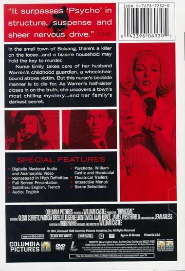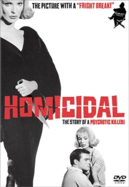 Homicidal represents producer/director William Castle's slant on Hitchcock's Psycho. The film concerns a young woman named Miriam Webster (Patricia Breslin) who seemingly has everything a girl could want - including a successful flower shop business, and a handsome beau, Karl (Glenn Corbett), who works as a pharmacist. Events take a turn for the worse, however, when Miriam's half-brother, Warren, returns from Europe - with a rather unpleasant friend in-tow: a blonde named Emily (Jean Arless). Emily promptly sets about destroying Miriam's life: the newcomer attempts to wheedle Karl away from Miriam, then rips the flower shop to pieces, then ultimately reveals a little taste for knife-wielding that directly threatens Miriam's safety. Like The Tingler and other Castle outings, this one originally featured a gimmick, preserved in the video release: a "fright-break" just prior to the climax, which allowed terrified audience members approximately 45 seconds to get out of their seats and leave the theater - to avoid the prospect of being "frightened to death."