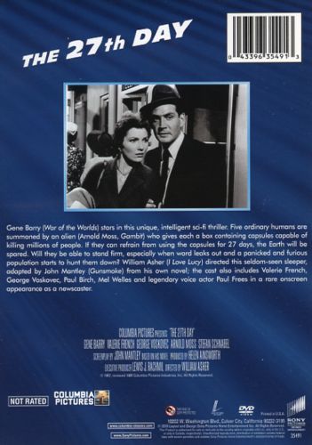 Five people – Englishwoman Evelyn Wingate, American reporter Jonathan Clark, Chinese peasant Su Tan, German physicist Klaus Bechner, and Soviet soldier Ivan Godofsky – are plucked from their everyday lives and transported to a spacecraft. There they are confronted by a humanoid calling himself “The Alien”, who explains that he is the representative from a world orbiting a sun about to go nova. Needing a new world within the next 35 days yet prohibited by their moral code from killing intelligent life, he provides each of the five with sets of three capsules, each capable of destroying all human life within a 3,000-mile diameter, with the expectation that humans will use the capsules to obliterate themselves, leaving the planet free for alien colonization. The capsules are distributed in containers that can only be opened by the thought waves of the person to whom they were given, but the capsules themselves can be used by anyone over the next 27 days, after which they will be rendered inert.