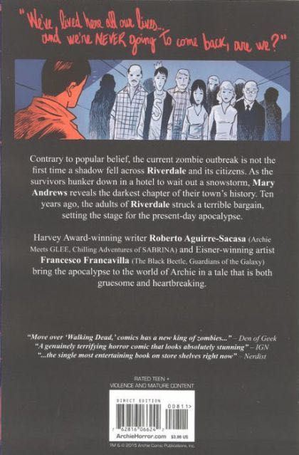 'Ghosts of Christmas Past.' Contrary to popular belief, the current zombie outbreak is not the first time a shadow fell across Riverdale and its citizens. As the survivors hunker down in a hotel to wait out a snowstorm, Hiram Lodge and Mary Andrews relive the darkest chapter of their town's history. Ten years ago, the adults of Riverdale struck a terrible bargain with the witches of Greendale, setting the stage for the present-day apocalypse. With a regular cover by Francisco Francavilla and a 'Cheerleader' variant by Andrew Pepoy.
