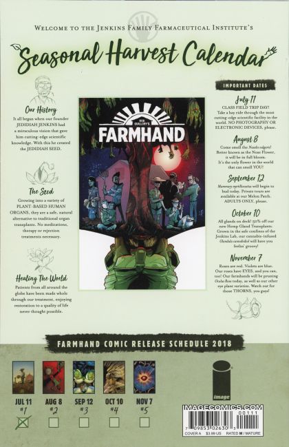 SERIES PREMIERE! Jedidiah Jenkins is a farmer-but his cash crop isn't corn or soy. Jed grows fast-healing, plug-and-play human organs. Lose a finger? Need a new liver? He's got you covered. Unfortunately, strange produce isn't the only thing Jed's got buried. Deep in the soil of the Jenkins Family Farm, something dark has taken root, and it's beginning to bloom. From ROB GUILLORY, Eisner-winning co-creator and artist of Image Comics' CHEW, comes a new dark comedy about science gone sinister and agriculture gone apocalyptic. Nature is a Mother.