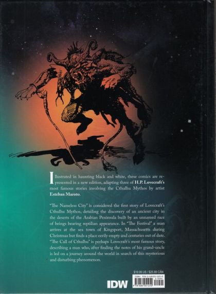 Illustrated in haunting black and white over 30 years ago, these comics are re-presented in a new edition, adapting three of H.P. Lovecraft's most famous stories involving the Cthulhu Mythos. "The Nameless City" is considered the first story of Lovecraft's Cthulhu Mythos, detailing the discovery of an ancient city in the deserts of the Arabian Peninsula built by an unnamed race of reptilian beings. In "The Festival," a man arrives at the sea town of Kingsport, Massachusetts during Christmas but finds a place eerily empty and centuries out of date. "The Call of Cthulhu" is perhaps Lovecraft's most famous story, describing a man who, after finding the notes of his granduncle, is lead on a journey around the world in search of a mysterious and disturbing phenomenon.