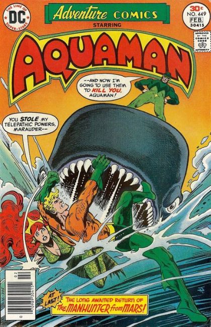 Whle Aquaman battled to reclaim the Atlantean throne from the Shark, a new marine menace introduced himself to the surface world. A cargo ship, bound for Europe, is hijacked by the Marine Marauder. Surrounding the vessel with a pod of whales, the Marine Marauder threatens to have the whales crush the ship if his demands are not met. He puts the entire crew off in life boats, then takes the ship, with it's cargo of medical supplies, for himself. The Marine Marauder has stolen a shipment of swine flu vaccine, intended to stave off an epidemic, threatening to break out all across Europe. Responding to an alert from his Justice League of America communicator, Aquaman receives a message from the Flash, informing him of the situation. A second shipment of the vaccine is already en route to Europe, this time with a NATO escort. Once again, the Marine Marauder appears on the horizon, riding atop a sperm whale. Sending out a telepathic command, the Marine Marauder is joined by an entire pod of sperm whales, which rapidly bear down on the NATO convoy. With the Marine Marauder focused on the attack, he is unaware that Aquaman has stealthily climbed onto the Marine Marauder's whale. Mera, using her ability to create hard water constructs, erects a barrier between the pod and the ships. Mera's presence tips off the Marine Marauder that Aquaman, too, must be in the vicinity. He quickly turns to find Aquaman sneaking up on him. Issuing forth a telepathic command, the Marine Marauder has Aquaman knocked off the whale's back by attacking dolphins. The ramming power of the pod prove too much for Mera, who lapses into unconsciousness as the whales batter through her defenses. With both Aquaman and Mera together in the water, the Marine Marauder telepathically commands one of his whales to devour them.As the whale's jaws closed over them, Aquaman, at the last moment, leaped forward, carrying Mera, so as to avoid the whale's teeth. This still left the heroic duo trapped inside the gullet of the whale.
