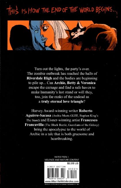 New Ongoing Series! The horror continues as a zombified Jughead goes on a relentless hunt for brains in this shocking new series by Harvey Award-winning comic/screenwriter Roberto Aguirre-Sacasa (Stephen King's Carrie, Archie Meets Glee) and Eisner-winning artist Francesco Francavilla (Batman, Black Beetle). When he performs a despicable and frightening act in front of everyone at the Halloween dance, tensions start to rise and fears begin to mount-who will be next to join Jughead in the Afterlife? And what about those who are already infected? Be warned, kiddies, this one's not for the faint of heart!