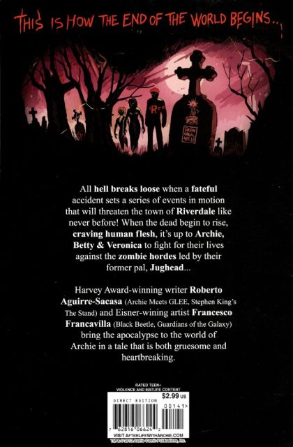 NEW ONGOING SERIES! 'Escape From Riverdale'-This is how the end of the world begins Harvey Award-winning writer Roberto Aguirre-Sacasa (Carrie, Archie meets Glee) and Eisner-winning artist Francesco Francavilla (Batman, Black Beetle) take Archie and the gang where they've never been before-to the grave and back! A horrific accident sets off a series of grim events and Sabrina the Teenage Witch must try to repair the unspeakable evil her spell has unleashed. Gasp in horror as Riverdale faces an impending zombie Arch-pocalypse in this brand-new, spine-tingling ongoing series-but be warned, kiddies, this one's not for the faint of heart! For TEEN+ readers.