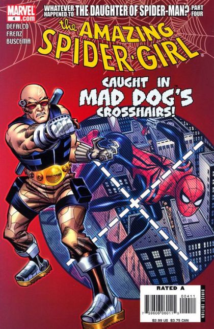 "Part 4" - As Spider-Girl continues her hunt for Hobgoblin and the lethal legacy of Wilson Fisk, the former Kingpin of Crime, a vicious new player enters the fray: Mad Dog--the bounty hunter who employs the weapons of the former super-villains he's captured.