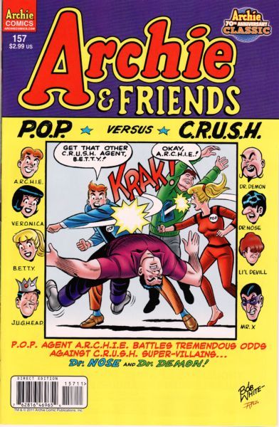 (W) Frank Doyle (A) Bob White, Mario Acquaviva, Sal Contrera 'The Man From R.I.V.E.R.D.A.L.E.': 'The Nose Knows!' and 'Enter The Demon.' P.O.P. operatives A.R.C.H.I.E., R.E.G.G.I.E., and J.U.G.H.E.A.D. face off against the infamous C.R.U.S.H. agent Dr. Nose after he subdues Pop and captures V.E.R.O.N.I.C.A. In this thrilling story, the gang must battle explosive robots and corporate espionage to save the day! Dr. Demon is up to no good again in 'Enter the Demon,' but can he get to Lodge Industries' secret weapon before P.O.P. does?