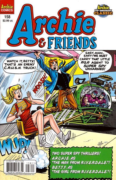 (W) Frank Doyle (A) Bob White, Mario Acquaviva, Joe Edwards 'The Man From R.I.V.E.R.D.A.L.E. in Undercurrent!' In the middle of a top secret mission, P.O.P. spies A.r.c.h.i.e. and V.e.r.o.n.i.c.a. are apprehended at the hands of C.R.U.S.H. Agents and taken to Super Spy's lair! Can B.e.t.t.y. and R.e.g.g.i.e. rescue their friends before Super Spy extracts all of P.O.P.'s secrets from his captives? And in 'Who Screams Last? Screams Best!' it's B.e.t.t.y.'s turn to get taken hostage by Super Spy but he wasn't counting on her secret weapon!