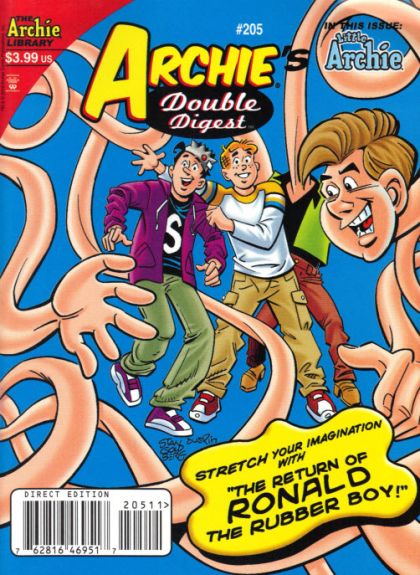 (W) Tim Kennedy, George Gladir (A) Pat Kennedy, Jeff Shultz Ronald had the bad habit of swallowing chewing gum. He swallowed so much gum that he began to take on its elastic properties, making him the goofy teenage equivalent of some famous super-stretchy guys! Now, In 'The Return of Ronald the Rubber Boy,' he's back and bouncier than ever, in a tale that's sure to stretch your funny bone! Then, Archie looks just like 'The Pro' snowboarder who's popular with the ladies, and he aims to meet those ladies by pretending to be that snowboarder! Finally, Archie reminisces about the love triangle throughout the years and how Betty and Veronica have always competed for him as he wanders 'Down Memory Lane.'