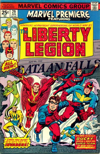 The Invaders/Liberty Legion Crossover: Part 2 of 4 - "Lo, the Liberty Legion!" Written by Roy Thomas. Art by Don Heck and Vince Colletta. Story continued from Invaders (1975-1979 Marvel 1st Series) #5. The worst case scenario has happened! The diabolical Red Skull has ceased control of the minds of the Invaders. Now Captain America, Prince Namor, and the Human Torch fight for him. Bucky must assemble a team of America's homefront heroes to save his friends and America from the villain's evil plans. Enter: The Liberty Legion! Featuring the Golden Age heroes The Patriot (Jeffrey Mace), Red Raven, the Thin Man, the Whizzer, Miss America, Jack Frost and the Blue Diamond. Story continues Invaders (1975-1979 Marvel 1st Series) #6. 32 pages FC. Marvel Value Stamp. Cover price $0.25.