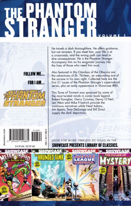 SHOWCASE PRESENTS THE PHANTOM STRANGER VOL. 1 TP Written by Bob Kanigher, Dennis O'Neil, Gerry Conway, John Broome, Len Wein, and others Art by Carmine Infantino, Curt Swan, Nick Cardy, Jim Aparo, Murphy Anderson, Neal Adams, and others Cover by Jim Aparo, Neal Adams and Bill Draut Over 500 pages of supernatural phenomena with tales from the Phantom Stranger and his skeptical counterpart Dr. 13! This volume reprints Showcase #80 and spooky tales from The Phantom Stranger #1-21. Advance-solicited; on sale October 18 ? 544 pg, B&W $16.99 US