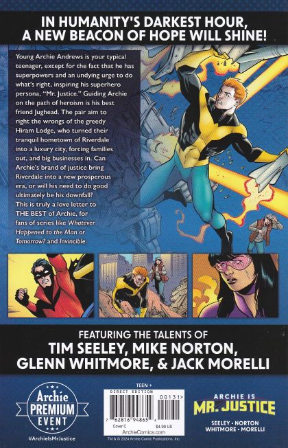 BRAND NEW 4-PART ARCHIE PREMIUM EVENT LIMITED SERIES! Young Archie Andrews possesses super strength, super speed, invincibility, and an undying urge to do what's right for the world. His only 'weakness' is his need to see the good in others, no matter how terrible they may be. His beloved hometown of Riverdale isn't the welcoming town it once was, Mr. Lodge tried to turn it into a more modern, luxury city instead, which pushed a lot of families out and left a lot of buildings uninhabited. A lot of the 'old timers' stuck around, but without progress and the financial stability to keep anything viable, it's looking more and more like a ghost town. Archie's goal isn't just to restore Riverdale to its former glory-it's to bring it into the future, too. And in this first issue, we learn of how Archie became MR. JUSTICE, all from the perspective of his best friend, Jughead Jones. This is truly a love letter to THE BEST of Archie, for fans of series like Whatever Happened to the Man or Tomorrow? and Invincible.