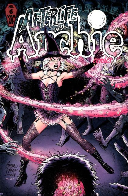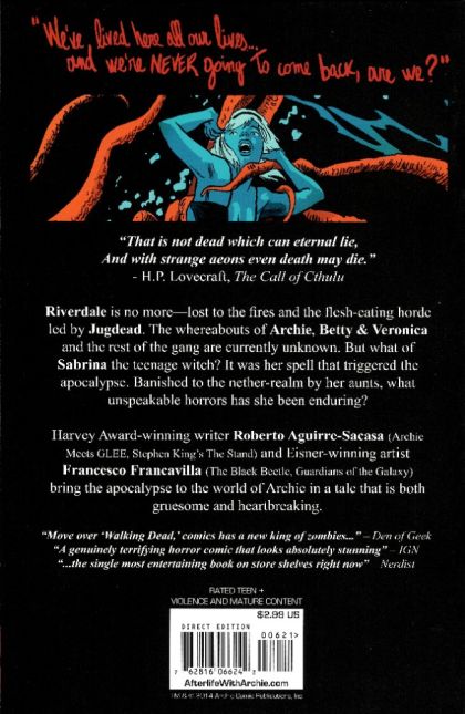 'The Nether-Realm.' The unthinkable has happened: Riverdale has become Ground Zero for the zombie apocalypse, and the surviving members of our gang have been forced to flee their beloved home. However terrible things have been for Archie and friends, they've been much worse for Sabrina the Teenage Witch. Banished to witches' purgatory after using the dreaded Necronomicon, she's now fighting for her immortal soul! A perfect entry-point for new readers as the smash horror TEEN+ hit continues! Definitely not for all ages!