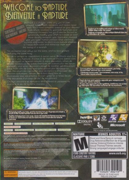 BioShock is a revolution in the shooter genre that will forever change the expectations for the FPS. Going beyond "run and gun corridors," "monster-closet AIs" and static worlds, BioShock creates a living, unique and unpredictable FPS experience. BioShock is the Shooter 2.0.