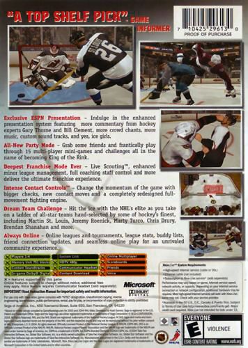 Poised to defend its title as the #1 rated hockey video game*, ESPN NHL Hockey returns to the ice with the confidence of a seasoned veteran. Improved player control, an all-new fighting engine and lightning fast gameplay truly capture the feel and pace of NHL-caliber hockey. Plus, breakthrough new ways to play including online leagues, multi-player mini-games and a deeper franchise mode add endless replay value to an already robust lineup of features. With an exclusive ESPN presentation system -- including on-ice action called by Gary Thorne and Bill Clement -- ESPN NHL Hockey 2005 makes skating with the NHL's elite a reality!
