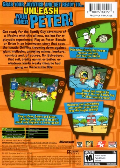 Family Guy will feature the offbeat humour of the show's writers in an action/adventure game focusing on the lovable oaf Peter Griffin, his world domination-obsessed son Stewie and their talking, martini-drinking dog, Brian. Throughout the game, these popular characters wreak havoc in many of the same locations depicted in the animated series.