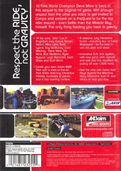 Dave Mirra Freestyle BMX 2 offers players eight new fully interactive game environments that are four times as big as those in the previous game and integrate traffic systems with moving vehicles, fellow riders and pedestrians. This franchise's open trick system defines the word 'freestyle'. There will be 1,500+ tricks possible in the game, more than any other BMX or skateboarding game. In addition, the raucous soundtrack features new cuts by top artists. Dave Mirra Freestyle BMX 2 features 10 multi-player games, including the Bikathalon, which gives riders the chance to muster all the multi-player games into one huge competition.