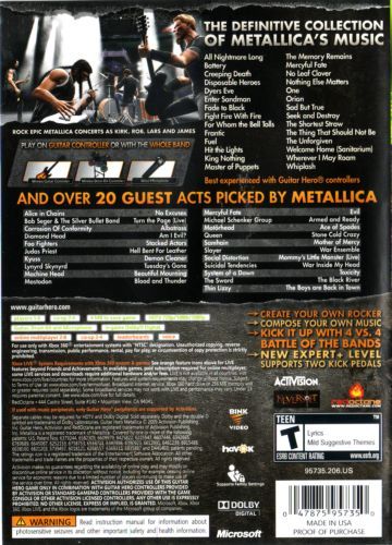 "Ride the Lightning" with musical icons Metallica and over 20 other rocking acts in an all new Guitar Hero experience - Guitar Hero Metallica. Enter the world of Lars Ulrich, James Hetfield, Kirk Hammett and Robert Trujillo and experience the intensity and skill of one of the greatest bands of all time. Shred on guitar, rip on drums and wail on the mic to a set list featuring over 45 explosive hits from Metallica's illustrious career and a wide variety of other legendary artists personally selected by the band, such as Alice In Chains, Foo Fighters and Queen. Fans will be able to rock as Metallica while performing in venues reminiscent of the band's epic album covers, themes from their music and real world locales.