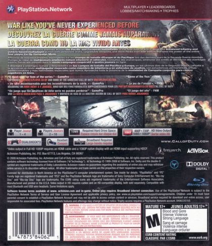 Building on the Call of Duty 4 engine, Call of Duty: World at War thrusts players into the ruthless and gritty chaos of WWII combat like never been before, and challenges them to band together to survive the most harrowing and climactic battles of WWII that led to the demise of the Axis powers on the European and South Pacific fronts. The title re-defines WWII games by offering an uncensored experience with unique enemies and combat variety, including Kamikaze fighters, ambush attacks, Banzai charges and cunning cover tactics, as well as explosive on-screen action through all new cooperative gameplay.