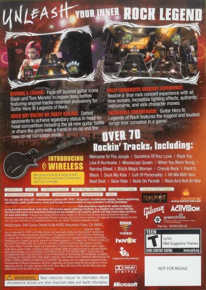Guitar Hero III: Legends of Rock drops you into the spotlight of the largest and most legendary rock concert ever. The star-studded soundtrack includes master tracks by such legendary artists as Guns N' Roses, The Rolling Stones, Beastie Boys, Muse and Pearl Jam, with added songs as made legendary by Kiss, Alice Cooper and Heart. Now drop that air guitar, tune your exclusive new Les Paul Guitar Controller and shred the night away with Guitar Hero III: Legends of Rock.