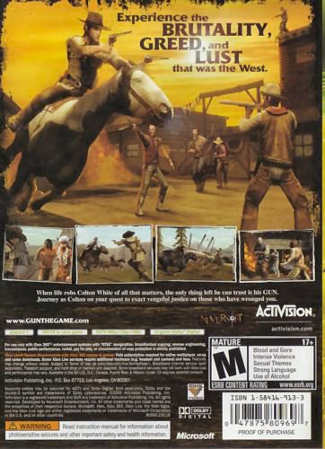 Set in the untamed West of the late-1800s, GUN is a free-roaming action-adventure game that takes players to a world without laws where greed, lust and murder are rampant. As Colton White, a vengeful gunslinger, players must straddle the line between good and evil as they showdown against corrupt lawmen, a murderous preacher, renegade army psychopaths, merciless outlaws and unforgiving Native Americans, while waging war on horseback, collecting bounties, and commandeering trains. Players travel through an action-packed landscape of high mountain wilderness, deserts and bustling territorial towns in an epic story of betrayal, greed, and revenge.