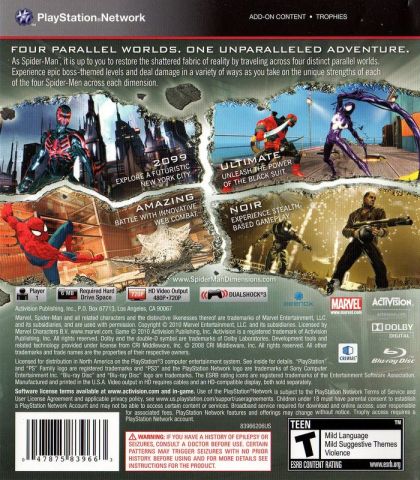 Spider-Man: Shattered Dimensions is a thrilling action-packed adventure set in four dramatically different universes from legendary Spider-Man lore, each with a distinct Spider-Man armed with unique skills and strengths, in one original storyline. Players will be transported to new locations never before seen in a Spider-Man game, from lush jungles and dusty deserts to various urban terrains. Acclaimed comic book writer Dan Slott takes players on a mission to contain the magical energy of the Tablet of Order and Chaos, which has been shattered and sent hurtling across parallel universes, and battle fan-favorite villains in a quest to restore the fabric of reality.