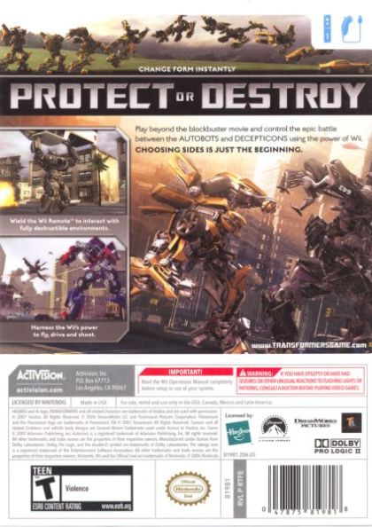 TRANSFORMERS: The Game lets gamers control the outcome in the battle for Earth as they choose to protect it as AUTOBOTS or destroy it as DECEPTICONS. Players will also experience the unstoppable power and massive scale of their favorite ROBOTS IN DISGUISE such as BUMBLEBEE, BARRICADE and others.