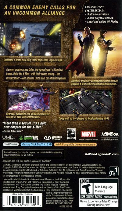 The sequel to the best-selling X-Men title ever, X-Men Legends, X-Men Legends II: Rise of Apocalypse is an all new action-RPG that lets players create, customize and control teams of four mutants from 16 all-time favorite X-Men and classic Brotherhood villains from the Marvel Universe. With the X-Men and Brotherhood fighting side by side for the first time, players switch instantly between teammates wielding many more super powers and skills than X-Men Legends, as they overcome obstacles, solve puzzles and defeat more than 100 types of enemies including Lady Deathstrike and the notorious Four Horsemen of Apocalypse. Delivering significant gameplay enhancements over the first title, X-Men Legends II: Rise of Apocalypse challenges players to explore immense, destructible environments set in classic X-Men locations like Genosha and the Infinite Factory, and exotic worldly locales like Egypt and the Savage Lands in both single player and, for the first time ever, online multiplayer modes.