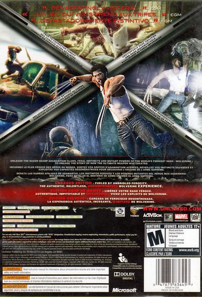 X-Men Origins: Wolverine is an epic action-adventure featuring a true-to-character Wolverine gameplay experience that takes gamers through and beyond the movie's storyline. Set in a variety of vivid real-world locales, the title challenges players to hone their animal instinct as they uncover hidden dangers, hunt and destroy enemies, and take on seemingly insurmountable situations while discovering the truth about Wolverine's tragic past. With razor-sharp adamantium claws unsheathed, the future X-Man enacts lightning-quick combat, evasive maneuvers, in-depth combo attacks, and an array of brutal finishing moves. Wolverine doesn't just deliver massive damage, either – he also takes it, thanks to his mutant regenerative power that heals him in real time right before the player's eyes.