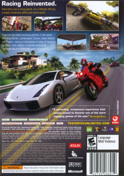 On the one hand Test Drive Unlimited is the world's first M.O.O.R. (Massively Open Online Racing) game, giving players an unprecedented online experience, but on the other hand Test Drive Unlimited is without doubt the ultimate automotive experience for car and bike enthusiasts alike whether they play through the game on or offline. In-game, players can visit the most sophisticated car and bike dealers to look at and purchase new vehicles or simply take them for a test spin. Players can then participate in 8 player races on or offline and take any of their vehicles for a cruise around more than 1000 miles of diverse Hawaiian roads. Further, players can collect and trade rare performance parts and customise each vehicle to make it one-of-a-kind. Additionally, gamers win races, challenges, missions and tournaments to earn credits and purchase new cars, bikes, rare performance parts, clothes, apparel, homes and garages.