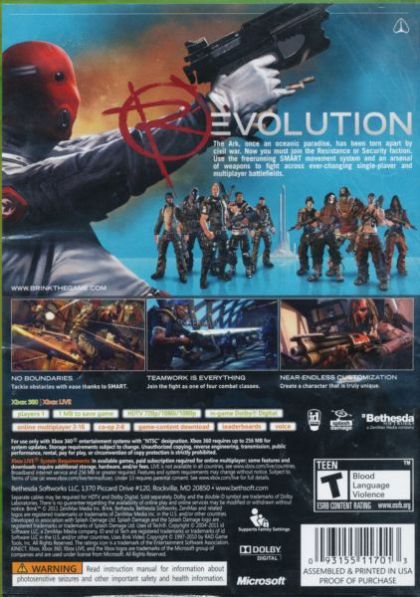 Brink is an immersive shooter that blends single-player, co-op, and multiplayer gameplay into one seamless experience, allowing you to develop your character across all modes of play. You decide the role you want to assume in the world of Brink as you fight to save yourself and mankind's last refuge for humanity. Brink offers a compelling mix of dynamic battlefields, extensive customization options, and an innovative control system that will keep you coming back for more.