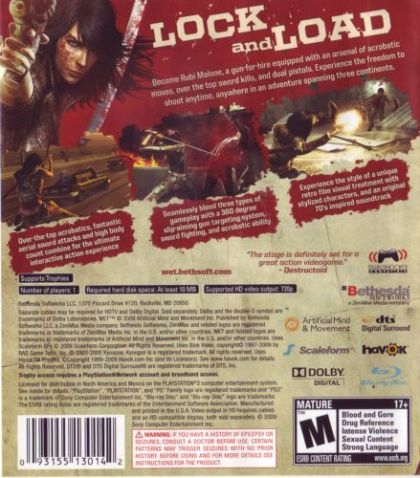 WET is a highly-stylized third person shooter that seamlessly blends gun play, sword kills and over-the-top acrobatics to create the ultimate interactive action experience. The game allows you to shoot anywhere, anytime. You will have the freedom to shoot while running, sliding down ladders, sliding across the floor, or performing any number of acrobatic moves. Featuring an ironic mix of humor and violence, unique retro film visual treatment, and original 70's inspired music, WET is a third- person shooter experience unlike any other.