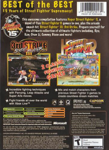 Street Fighter Anniversary Collection brings to you the best of the best in the ultimate beat-em-up compilation. Hyper Street Fighter II is a blend of five Street Fighter II games-in-one where you get to find out who is the greatest warrior. Street Fighter III: Third Strike is the arcade smash hit, available on a next-gen console for the very first time.