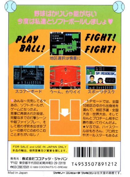 The object is to win the championship using female softball players. Players must choose between the six major high schools from all of the regions of Japan. After winning the Japanese high school championship, the player must take on the American women\'s softball team before becoming a professional softball player. I Love Softball is a Sports game, developed by Marionette and published by Coconuts Japan, which was released in Japan in 1989.