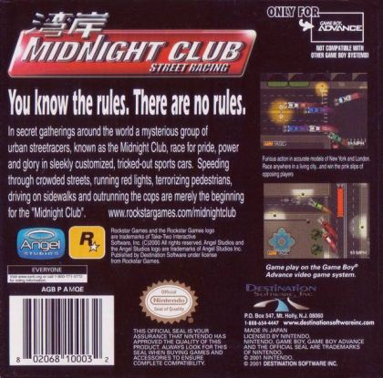 Midnight Club: Street Racing(GBA) is a racing arcade game developed by Rebellion Developments and published by Destination Software. Midnight Club: Street Racing(GBA) brings you a top-down view street racing action of high speed driving and adventure to the Game Boy Advance. The concept behind this game derives from the illegal races of real-world Midnight Clubs.The core gameplay consists of races of high-speed maneuvering through completely open city streets. Live life in the insane lane, escape the law and accumulate an arsenal of vehicles.