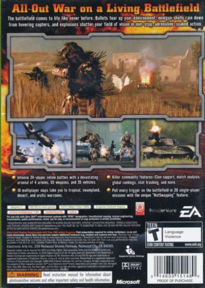 Battlefield 2: Modern Combat explodes onto Xbox 360, bringing the field of battle to life like never before. Bullets whiz by and score the environments around you, spent minigun shells rain down from hovering helicopters, and explosions shatter your field of vision. Delivering the over-the-top action of the award-winning Battlefield franchise, Battlefield 2: Modern Combat lets you wage modern war your way.