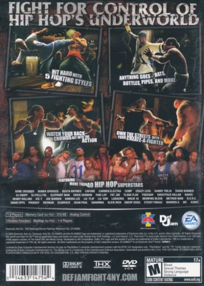 Survive the gritty reality of the urban underworld in Def Jam Fight For NY, the only fighting game featuring five intense fighting styles, hardcore hip hop music, more than 40 hip hop artists and celebrities, and seedy urban venues. Develop your fighting skills, get down with a crew, and battle for control of the underworld.