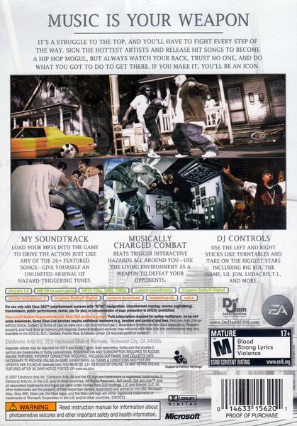 In collaboration with urban lifestyle powerhouse Def Jam Interactive, EA Chicago—the team behind the critically acclaimed EA SPORTS Fight Night series—is integrating hip hop culture and gaming like never before. With the hottest music seamlessly infused into the world around you, the game's environments pulsate, crumble, and explode to life with every bone-jarring beat. Time your attacks to the driving bass and use falling debris and exposed environmental hazards to pound your rivals.