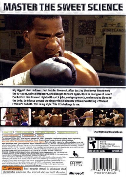 Knocking out the competition, EA SPORTS Fight Night Round 3 brings the most intense boxing videogame experience to the virtual ring. Film-quality graphics establish EA SPORTS Fight Night Round 3 as one of the best looking and playing Xbox 360 sports game on the market. The graphics showcase devastating punch impacts unparalleled in any game or film. Outside of the ring, gamers can establish intense rivalries through pre-fight events putting purpose and passion behind every hit.