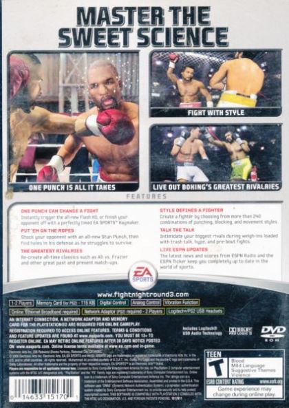 Knocking out the competition, EA SPORTS Fight Night Round 3 brings the most intense boxing videogame experience to the virtual ring. Film-quality graphics establish EA SPORTS Fight Night Round 3 as one of the best looking and playing Xbox 360 sports game on the market. The graphics showcase devastating punch impacts unparalleled in any game or film. Outside of the ring, gamers can establish intense rivalries through pre-fight events putting purpose and passion behind every hit.