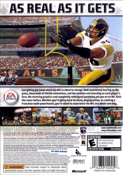 the official videogame license of the NFL and its players and in its 16th year of the franchise, Madden NFL 06 offers game changing innovation and complete NFL authenticity. With more than 40 million copies sold, Madden NFL Football continues to be the #1 football franchise.