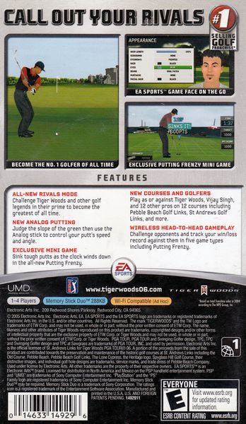 In Tiger Woods PGA TOUR 06 for the PSP portable system, players experience the pressure and intensity of playing against Tiger Woods and the other greats of golf anywhere, anytime. Create a golfer using the most advanced GameFace tools ever used in a handheld game, and battle your way up the all-time leader board in the all-new Rivals mode. With a new PSP portable system-exclusive mini game, 14 licensed golfers, and nine authentic PGA TOUR® courses, Tiger Woods PGA TOUR 06 for the PSP portable system challenges you to call out your rivals and prove yourself as the greatest golfer ever.